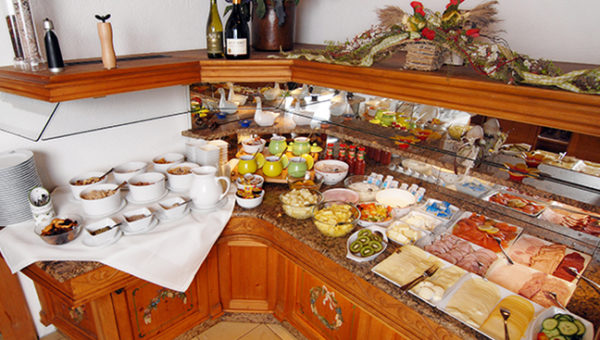 Hausgemachte Marmelade, frisches Obst, Joghurt, Cerealien, Eierspeisen, Käse, Schinken- und Wurstspezialitäten, Lachs, Säfte, Kaffee‑, Tee‑, & Kakao-Auswahl
